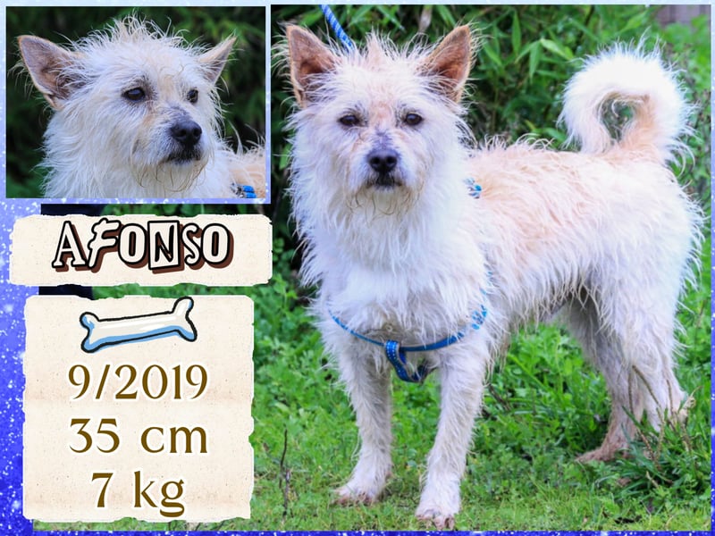 Afonso ist an das Leben im Haus und das Zusammensein mit Menschen gewöhnt. Er läuft gut an der Leine, versteht sich gut mit anderen Hunden.