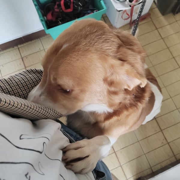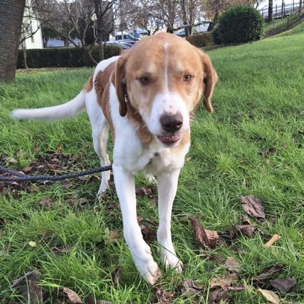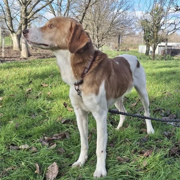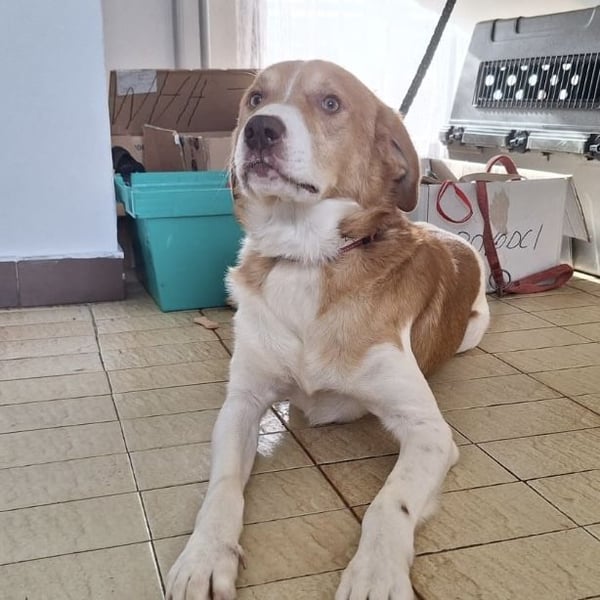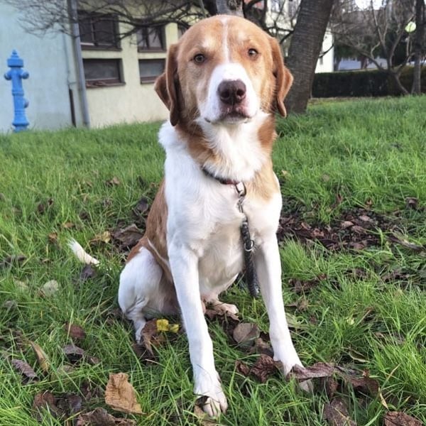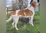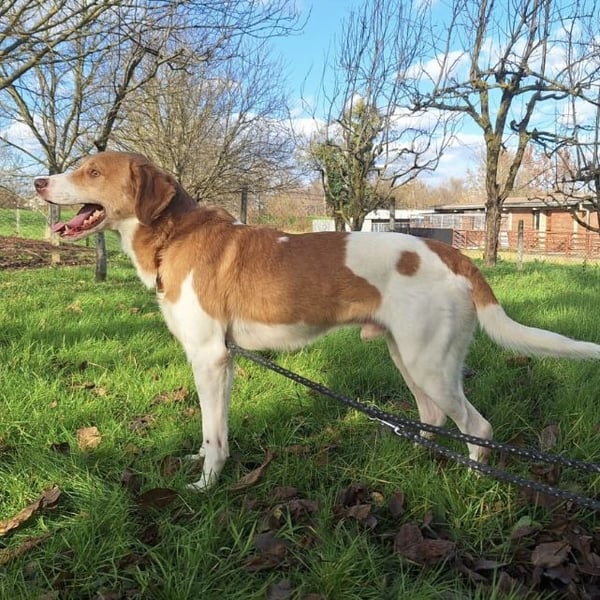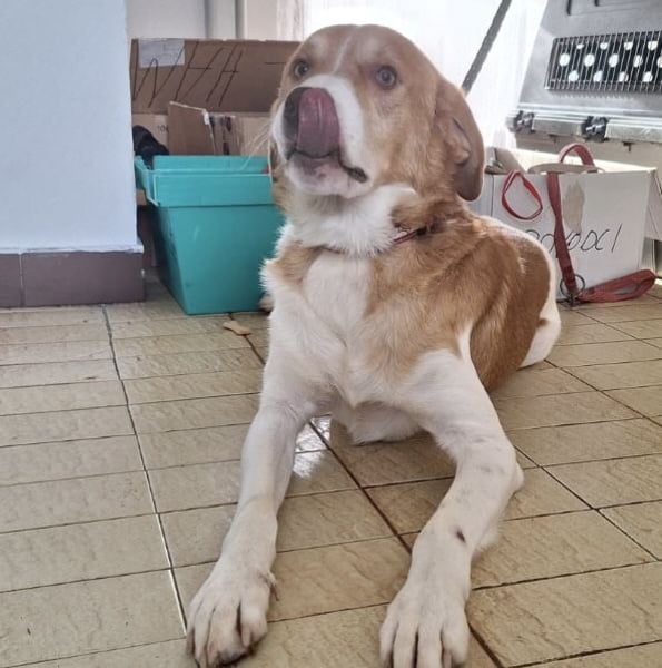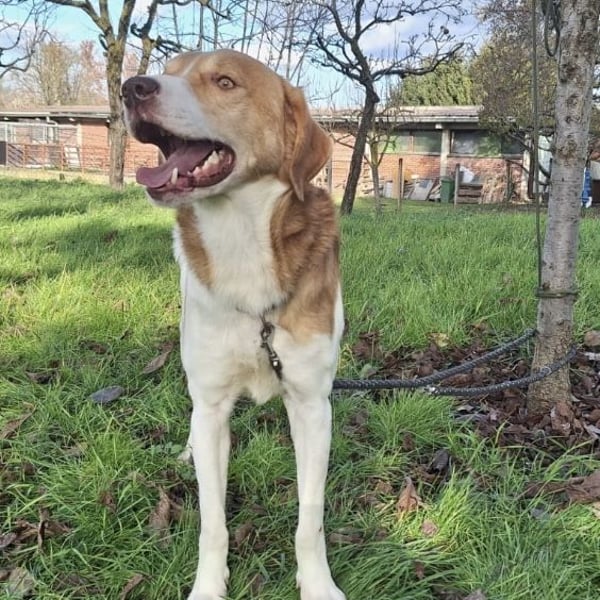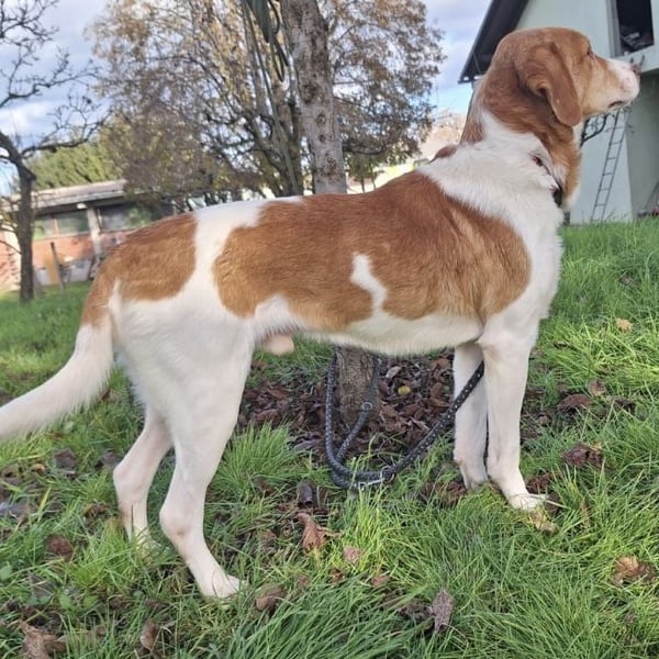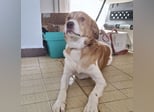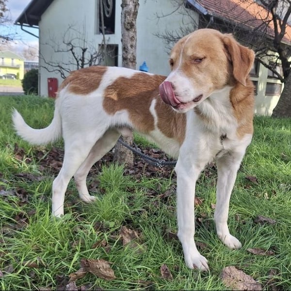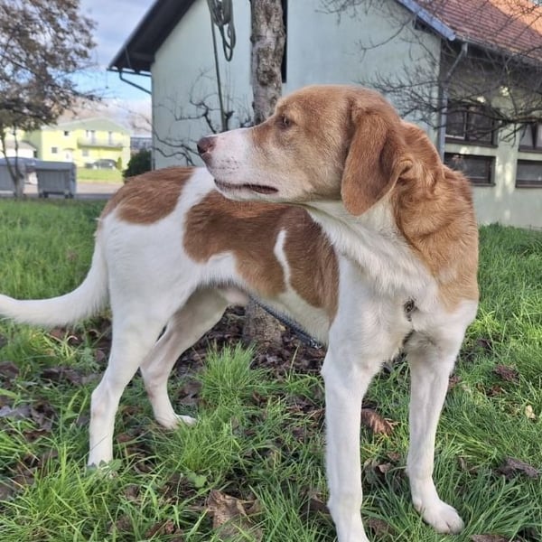 Snoopy ist ein Bub, er ist laut Tierarztschätzung ca. 4,5 Jahre alt (geb. 02.04.2020), er ist 60cm groß und wiegt 24,5kg. Vermutet wird ein Labrador-Save Bracke Mischling.