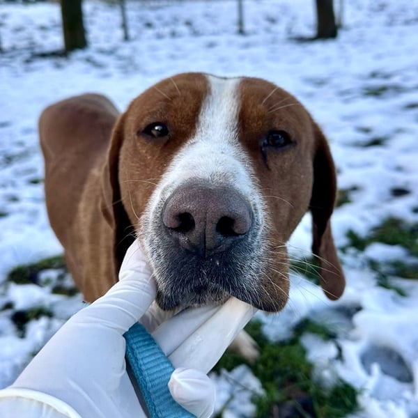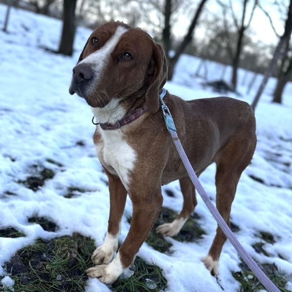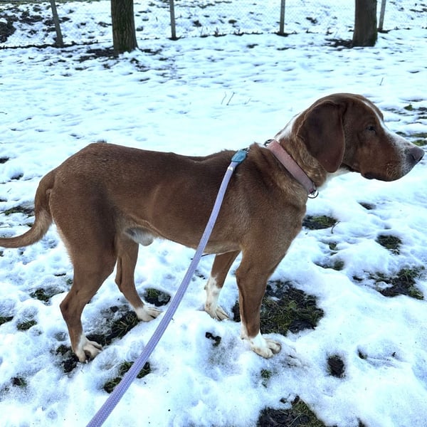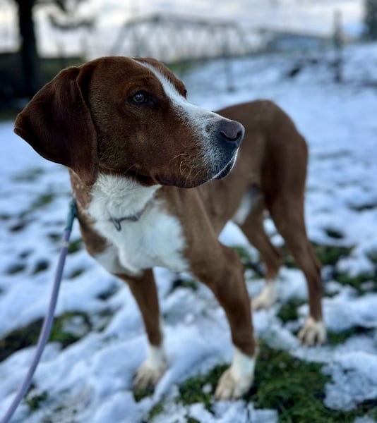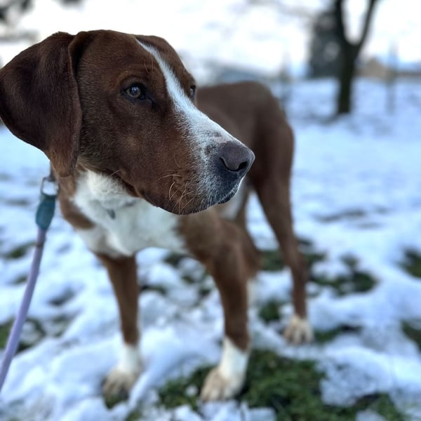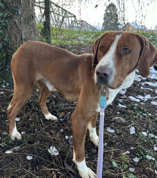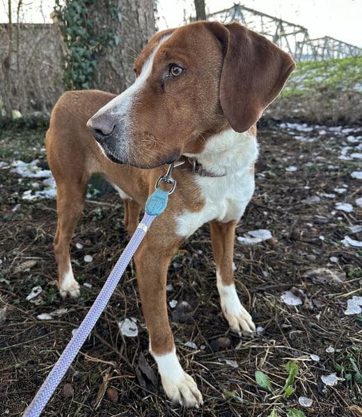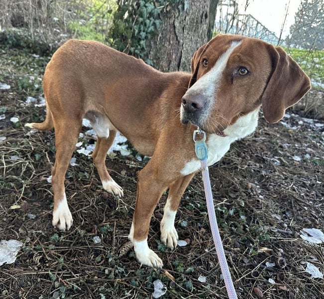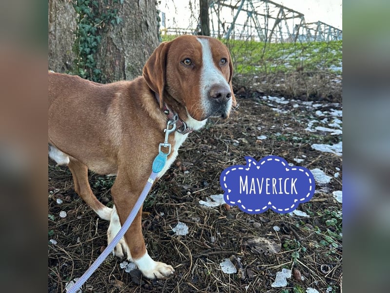 Maverick ist ein Rüde, laut Tierarztschätzung ca. 2 Jahre alt (geb. 05.12.2023), wiegt 27,7 kg und ist 50 cm groß. Er ist ein Save Bracke (Posavski Gonič), wahrscheinlich reinrassig.
