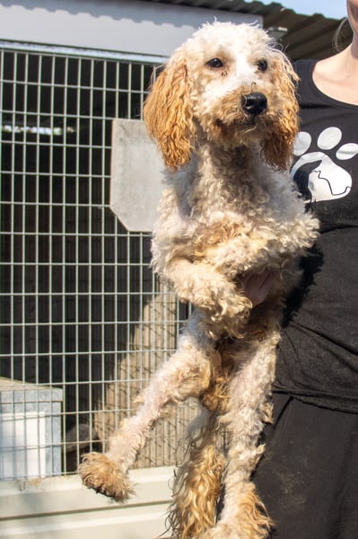 Ich bin ein kleiner Pudeljunge, in der Farbe Apricot. Ich bin einer von den ungewollten Welpen, die dem Billigmarkt schon zu alt waren. Ich bin zwar noch ein Welpe, aber ein bisschen eingeschüchtert. Aber mit ein bisschen Liebe werde ich sicher der welpentypisch verspielte Kerl, der ich sein sollte.