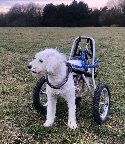 Seit Dezember 2021 hat er endlich eine Pflegestelle in Deutschland ergattert und hier kann er zum ersten Mal in seinem Leben richtig glücklich sein. Er bekam einen maß-angefertigten Rollstuhl und hat nun auf Spaziergängen richtig viel Freude. Von Anfang an hat er ihn super angenommen und läuft mit großer Begeisterung.