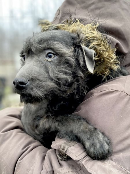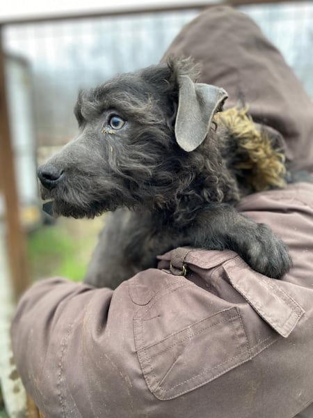 Sein Puli-Mix-Fell macht ihn allergikerfreundlich, denn er haart kaum und besitzt eine weiche, leicht lockige Struktur – perfekt für Menschen, die sensibel auf Hundehaare reagieren.