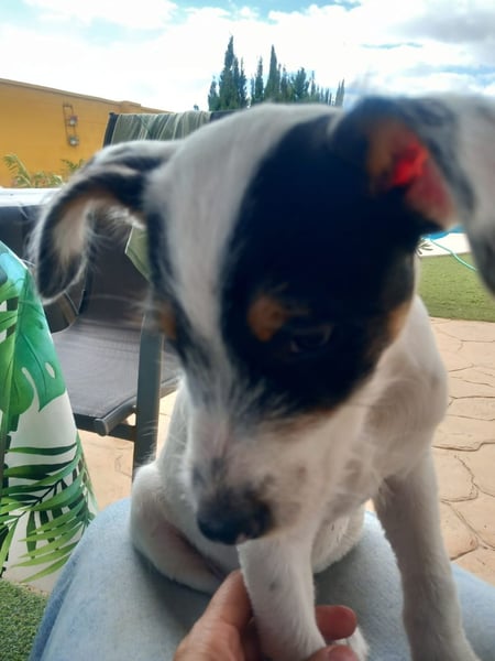 Ringo ist das schwarze Schaf seiner Familie, aber das ist auf sein Äußeres beschränkt, denn ansonsten ist er genauso verschmust, lustig und liebenswert wie seine Geschwisterchen. Und offiziell sind sowieso alle vier tricolor, wenn auch mit verschiedenen Farbanteilen. Wer Ringo überhaupt ist? Ein entzückender, 3 Monate alter (Stand Oktober 2025) Bodeguero-Mischling, der mit zwei Schwestern und einem Bruder in Huelva ausgesetzt wurde.