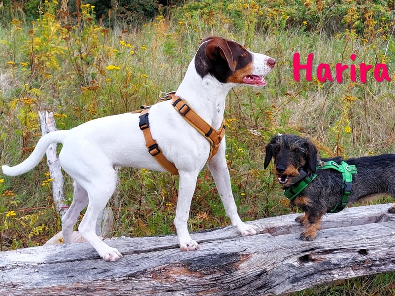 Aufgrund gesundheitlicher Umstände suchen wir für Harira, die in ihrem jetzigen Zuhause "Ria" genannt wird, ein neues Zuhause. Harira ist eine im Dezember 2024 geborene Mischlingshündin aus Südspanien und Ende Mai nach Deutschland gekommen. Sie ist eine verschmuste, aktive Junghündin, die draußen Bewegung liebt und drinnen angenehm ruhig sein kann. Harira ist clever, neugierig und steckt mitten in ihrer Junghundephase – sie möchte noch viel lernen und braucht klare, liebevolle Anleitung. Mit anderen Hunden spielt sie gern und zeigt sich insgesamt sehr kontaktfreudig. Katzen sollten nicht im Haushalt leben; mit Kindern hat sie bisher keine langfristigen Erfahrungen gemacht. Sie hat erste Tricks im Crossdogging gelernt, fährt problemlos Auto und übt gerade das Laufen am Fahrrad. Das Alleinebleiben klappt für kurze Zeit schon gut. Den Hundehort kennt sie ein- bis zweimal wöchentlich. Da sie bisher am Stadtrand lebt, braucht sie in der Stadt noch etwas Gewöhnung.
