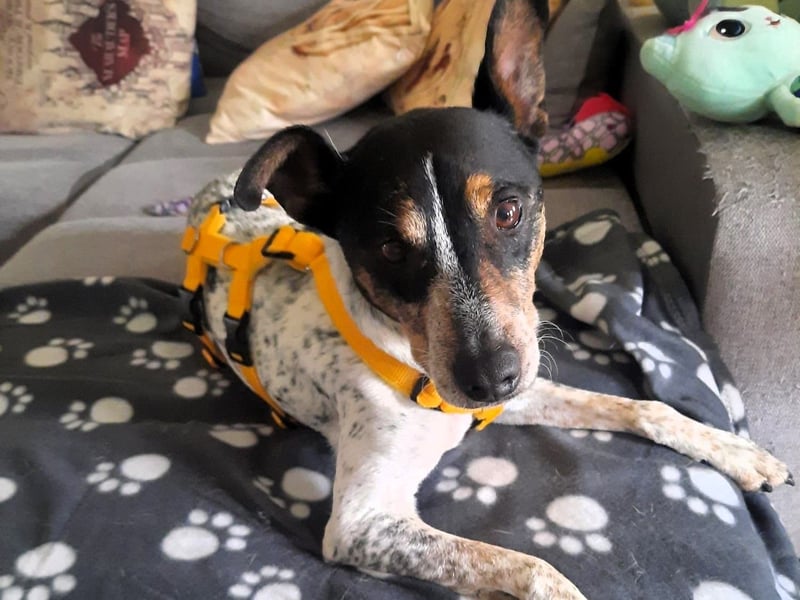 Aktuelle Maße: Schulterhöhe 43 cm, Halsumfang 28 cm, Rückenlänge 42 cm, Brust 50 cm, Taillé 45 cm, Gewicht 11,4 kg