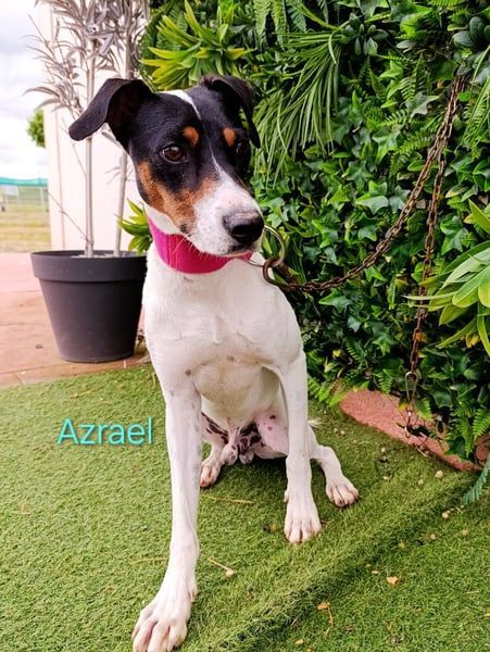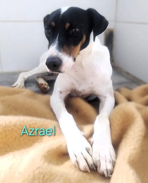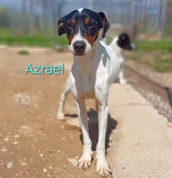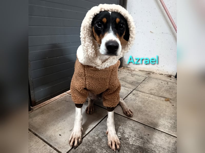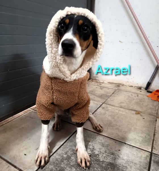 Azrael ist sehr lieb, aber noch ängstlich. Er wurde zusammen mit Eclipse aus einem Animal-Hoarding-Fall gerettet und hatte bisher kaum Kontakt zu Menschen. Er versteckt sich hinter seinem Bett oder sucht einen Ort, an dem er sich sicher fühlt. Er zeigt jedoch niemals Aggression – selbst wenn er Angst hat, lässt er sich anfassen, auch von Fremden. Mit anderen Hunden versteht er sich sehr gut: Er ist sozial, freundlich, unterwürfig und überhaupt nicht dominant. Er hat viel durchgemacht und braucht eine Familie mit Erfahrung im Umgang mit ängstlichen Hunden, die ihm mit Geduld, Verständnis und Liebe helfen, wieder Vertrauen in Menschen zu fassen. Er läuft bereits gut an der Leine.