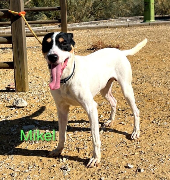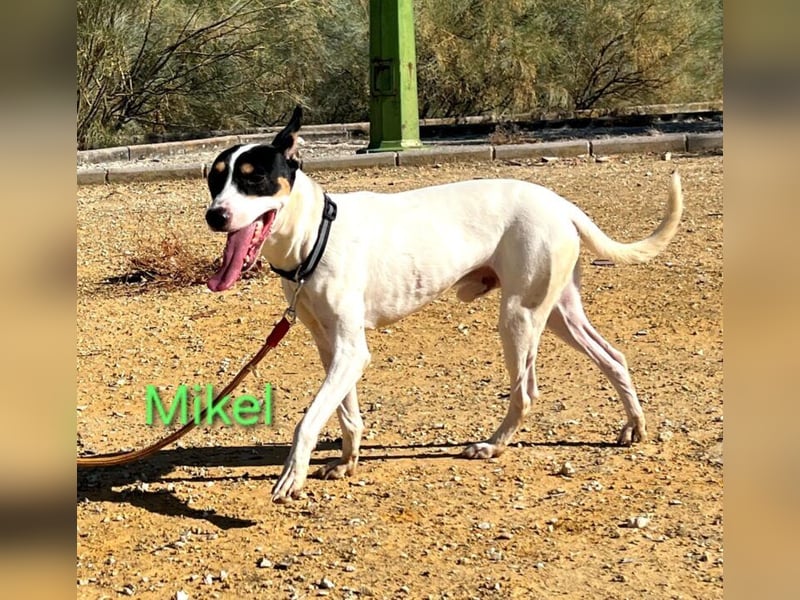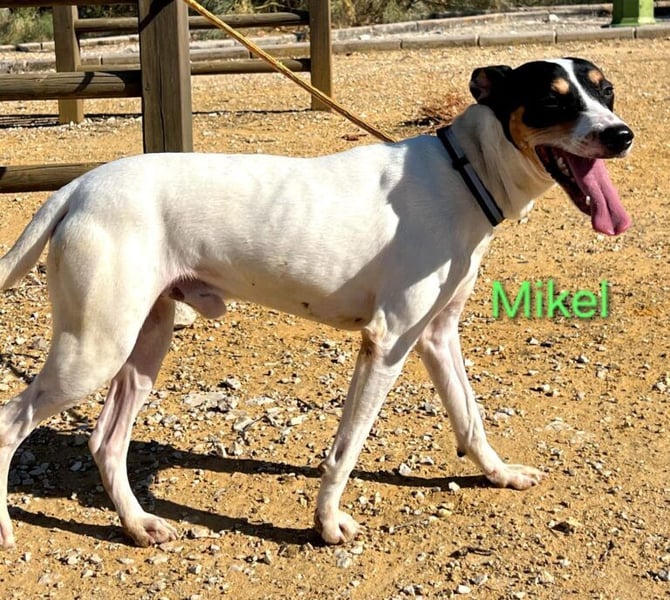 Mikel kam sehr verängstigt zu uns, sein früheres Leben war alles andere als leicht. Von allen Hunden, die aus jenem Haus gerettet wurden, hat er sich am meisten verändert. Seine Entwicklung verlief schnell und positiv, heute ist er ein ganz neuer Hund: vertrauensvoll, gutmütig, liebevoll, freundlich, aktiv und verspielt. Er ist sozial mit anderen Hunden, da er immer inmitten vieler Artgenossen gelebt hat.