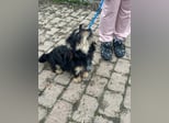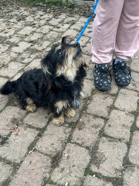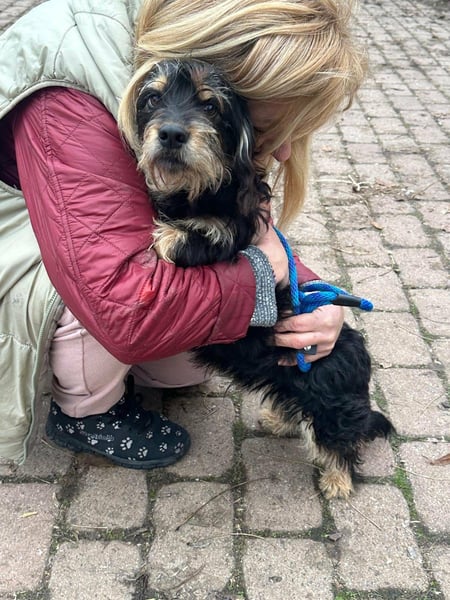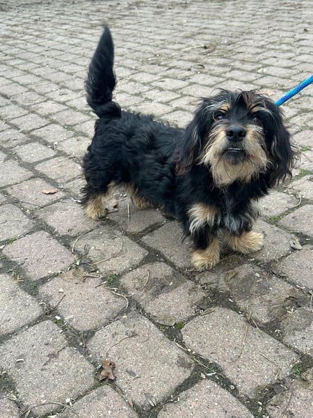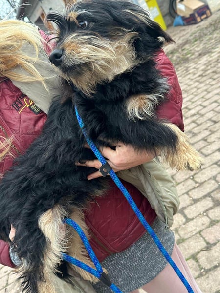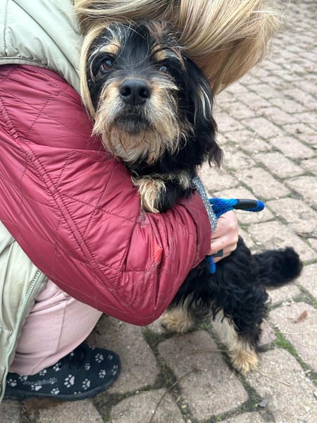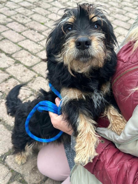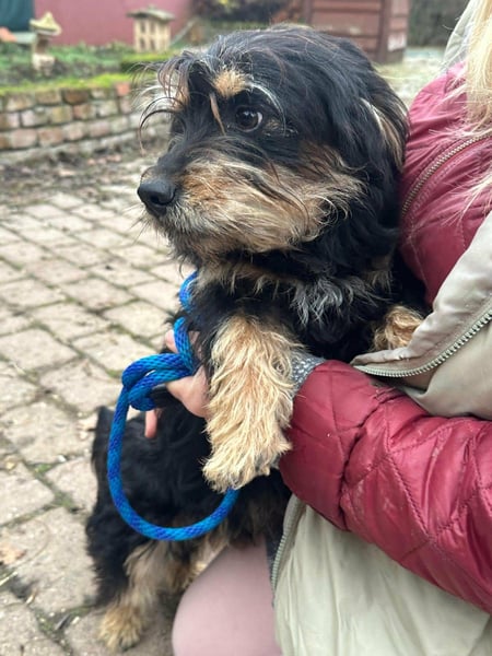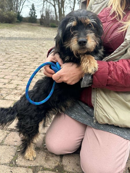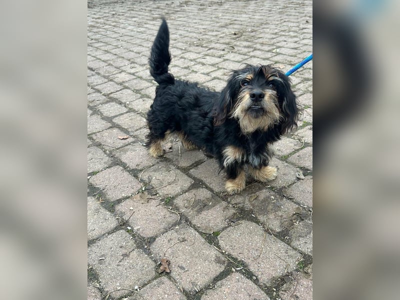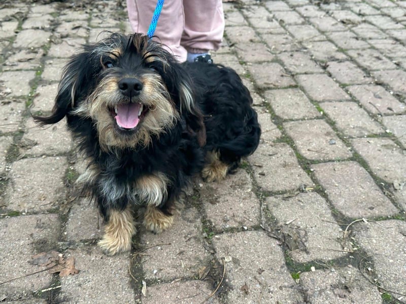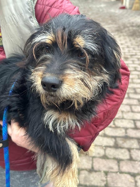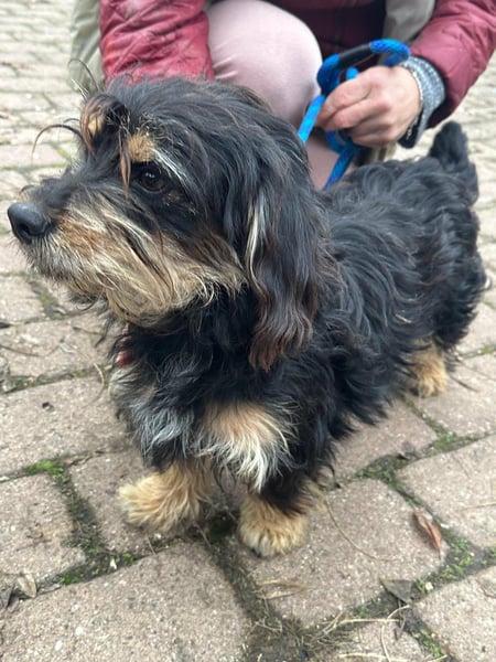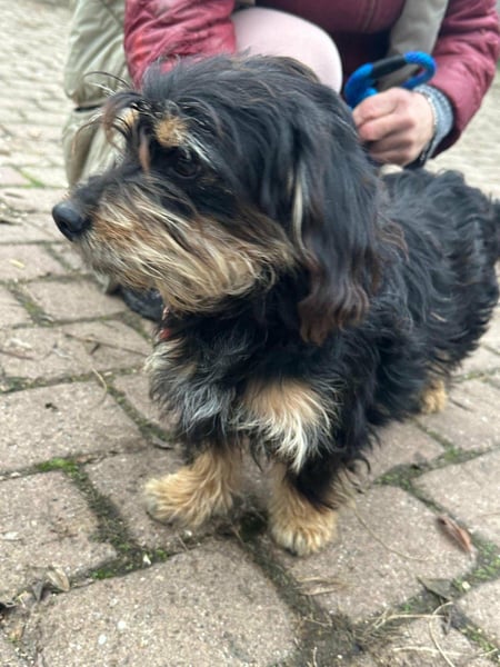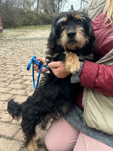 Hunter ist ein kleiner Rüde, geboren am 12. Juni 2023, etwa 28 cm groß, ca. 6,5 kg, und erinnert an einen Rauhhaardackelmix.
