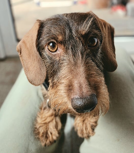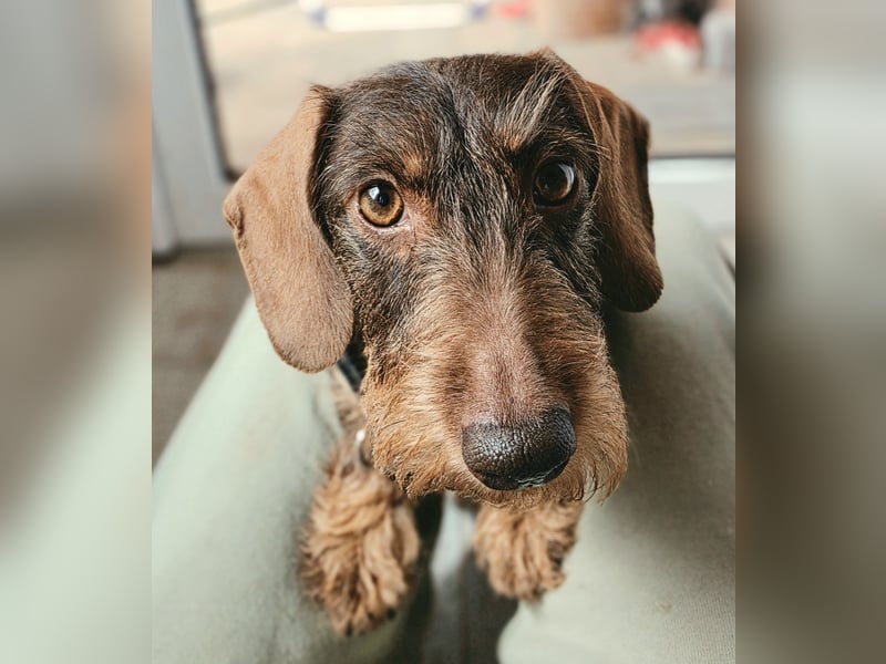 Sie ist eine 4 Jahre alte, kastrierte Zwergdackel-Hündin, ca. 4 kg schwer, rauhaarig, in Farbe braune-saufarben .