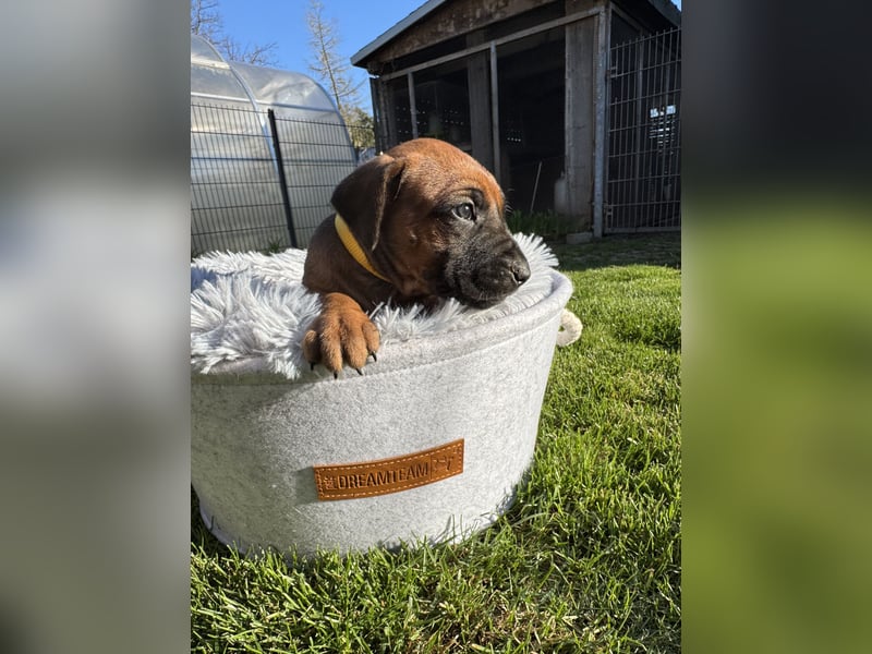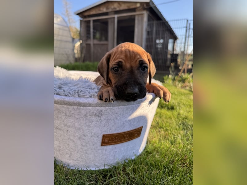 Ridgeback Welpen, bekannt für ihren markanten Rückenkamm, sind robuste, intelligente und selbstbewusste Hunde. Diese ursprünglich als Jagdhunde gezüchtete Rasse ist loyal und eignet sich hervorragend für aktive Familien. Ridgebacks benötigen konsequente Erziehung und ausreichend Bewegung, um ihre Energie und ihren starken Willen in die richtigen Bahnen zu lenken.