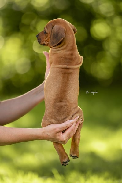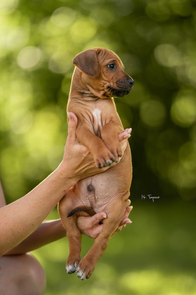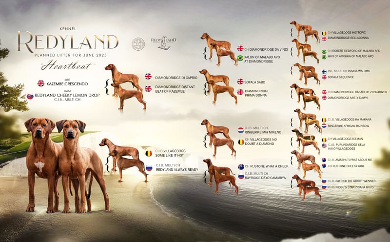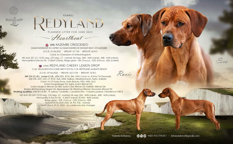 Die Mutter, Redyland Cheeky Lemon Drop \"Roxie\", ist der einzige Rhodesian Ridgeback in der Slowakei, der drei Rettungshundeprüfungen (Lawinen-, Flächen- und Trümmersuche) bestanden hat. Sie besucht aktiv Schulen und Kindergärten, um ihre Intelligenz und freundliche Natur zu zeigen, was sie zu einer wirklich außergewöhnlichen Hündin macht. Darüber hinaus ist sie Multi-Champion und Internationale Championess und wurde offiziell als Beste RR-Hündin der Slowakei 2024 ausgezeichnet. Roxie ist kerngesund, hat ein exzellentes Wesen und beeindruckende Arbeitsfähigkeiten.