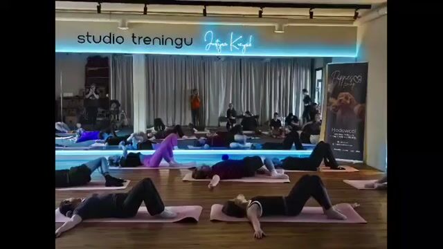 Sie haben in einer großen Turnhalle an Welpen-Yoga-Kursen teilgenommen, zusammen mit vielen verschiedenen Menschen.