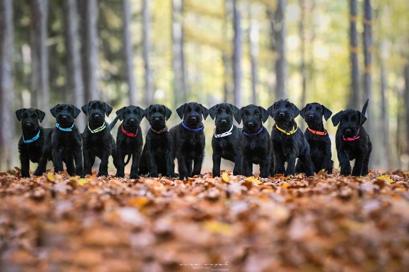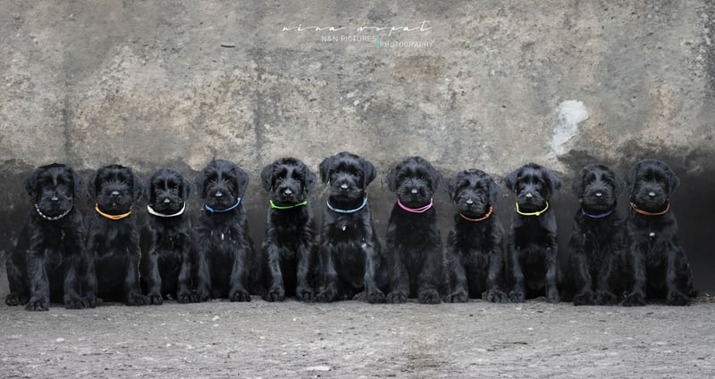 Unser Zuchtziel sind gesunde und im Wesen freie Riesen die Ihren Grundcharakter aber nicht verlieren sollen. Ab Geburt starten wir eine WhatsApp-Gruppe wo die zukünftigen Welpen Eltern sehr viel von der Entwicklung der Kleinen mitbekommen. Wir geben unser Bestes die Kleinen auf Ihr zukünftiges Leben vorzubereiten. Die Welpen werden bei uns im Haus geboren und wachsen im Haus auf, später ziehen die Kleinen in unseren Wintergarten und Ihr Umfeld wächst stetig mit(Garten usw.). Vor Abgabe machen wir ein professionelles Fotoshooting mit den Kleinen. Alle Welpen bekommen das Riesenschnauzerpaket von Laboklin. Dort werden die Kleinen auf folgende erblichen Krankheiten untersucht: Degenerative Myelopathie (DM Exon 2), Dilatative Kardiomyopathie (DCM), Hyperurikosurie (HUU/SLC), Progressive Retinaatrophie* (prcd-PRA) und Progressive Retinaatrophie (NECAP1-PRA) Es gibt eine ordentliche Rechnung mit ausgewiesener Mehrwertsteuer.