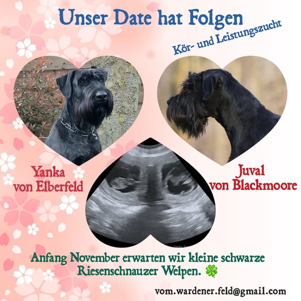 Anfang November erwarten wir (Tanja & Andreas Kempf) in der Zuchtstätte vom Wardener Feld Riesenschnauzerwelpen schwarz. Wir züchten im PSK/VDH. Unsere Zucht ist nach §11 zugelassen und abgenommen. Wer uns vorab kennen lernen möchte ist gerne in Alsdorf bei Aachen eingeladen. Mutter wird Yanka von Elberfeld. Mit Ihr durfte ich 2x an der DM der Riesenschnauzer teilnehmen. Aus dieser Linie kommt Leistung & Arbeitsbereitschaft. Yanka ist sehr sozial und sehr verträglich mit Mensch & Tier. Bei uns leben die Riesen im Rudel zusammen mit unseren Zwergschnauzern. Zum Vater: Juval von Blackmoore ist ein großer Knochenstarker Rüde, frei im Wesen. Er ist ein sportlicher Rüde der dieses Jahr an der DM der Riesenschnauzer teilgenommen hat. Beide Eltern haben die Hüfte mit Bestnote A1 ausgewertet. Juval ist frei von den getesteten Erblichen Krankheiten PRA-PRCD-N/N DCM-N/N NECAP1(PRA5)-N/N DM-N/N HUU-N/N. Augenuntersuchung ohne Befund.