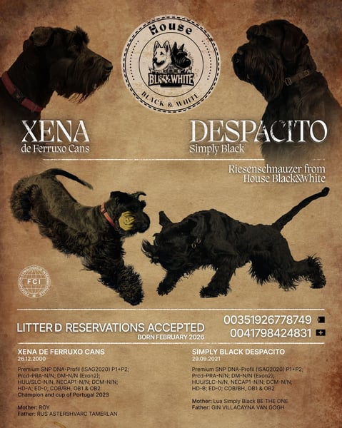 Wir sind Züchter aus Leidenschaft. von Weisser Schäfer / Suisse Blanc und Riesenschnauzer schwarz, die beim portugiesischen Kennel Club registriert sind, und Nachkommen werden den FCI-Affixe House Black&White haben.