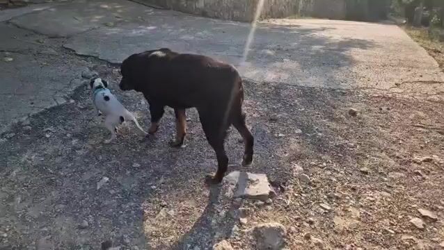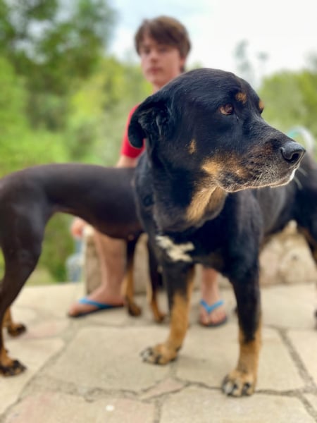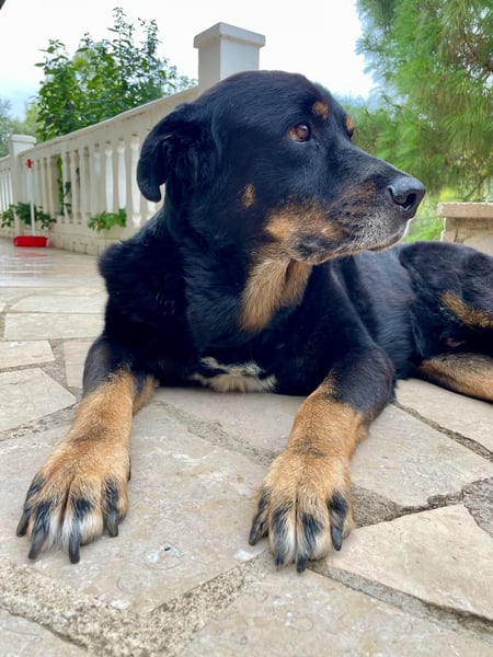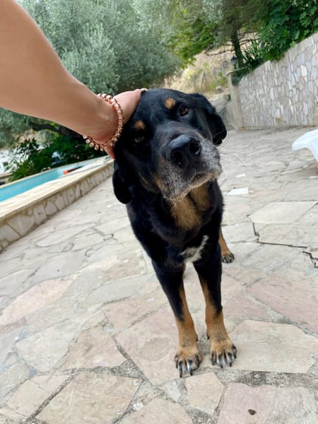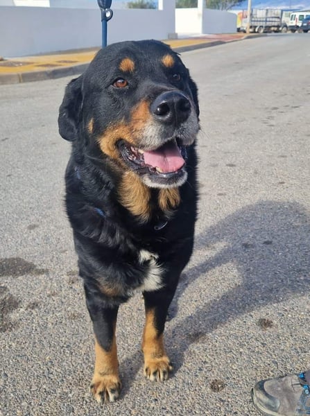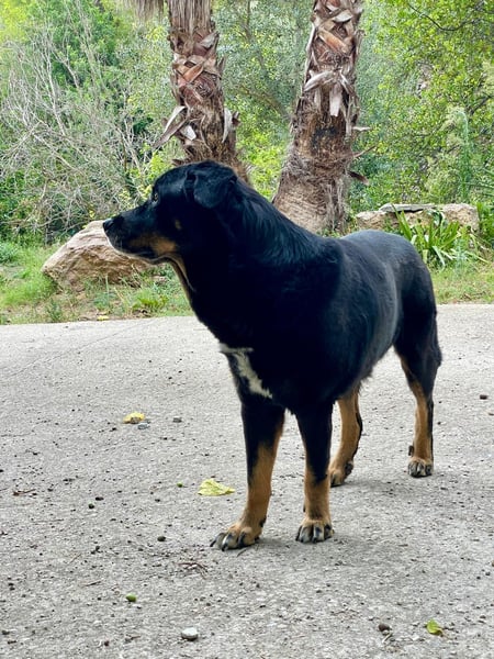 Der Rottweiler Mix hat keine Schmerzen und frisst ganz normal.