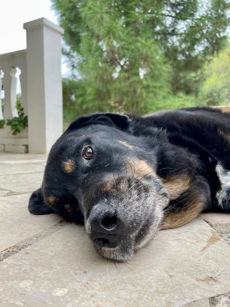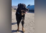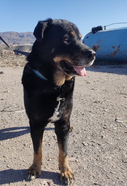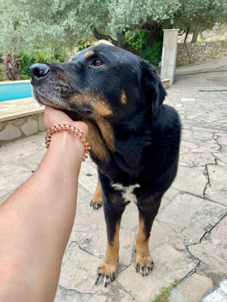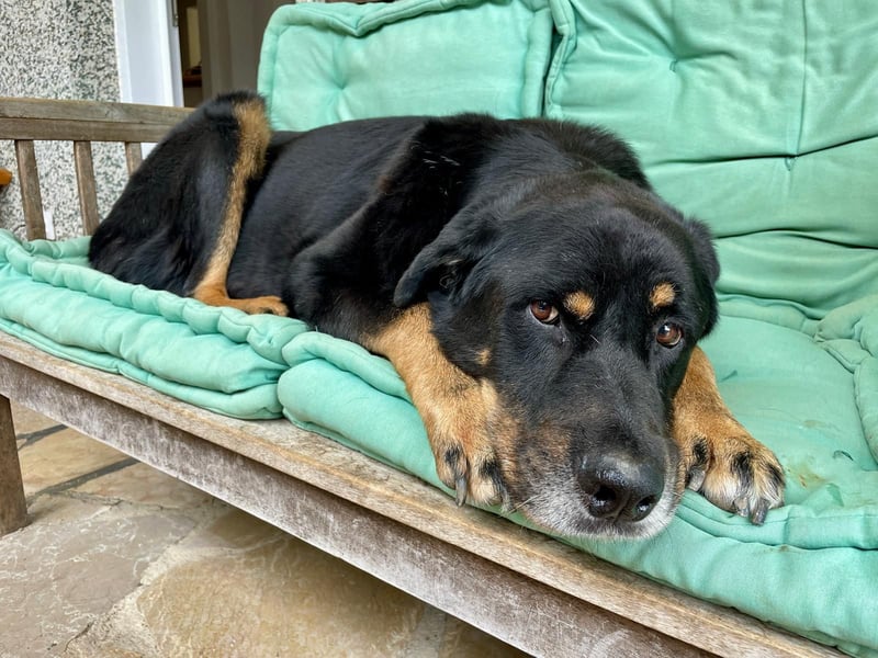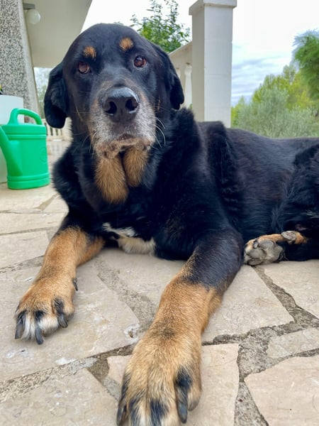 Der Rottweiler Mix hat keine Schmerzen und frisst ganz normal.