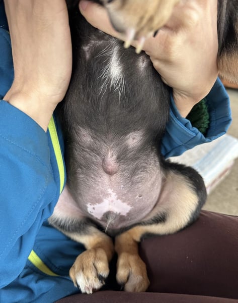 Besonders erwähnenswert: Rico hat eine Hernie am Bauch, er hat es seit seiner Geburt. Da sollte man absolut gar nichts machen, Hunde sind dadurch nicht beeinträchtigt und werden damit alt.