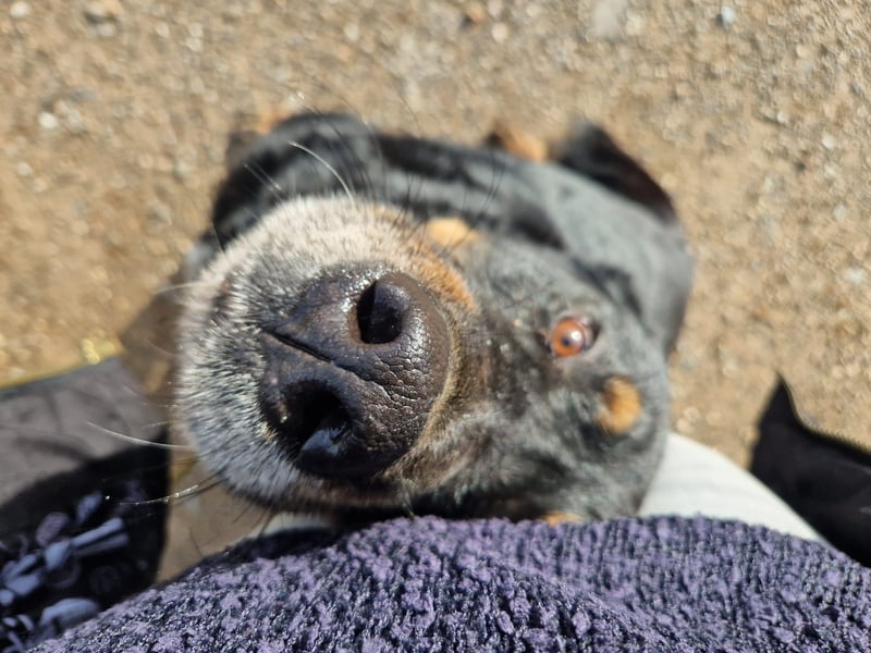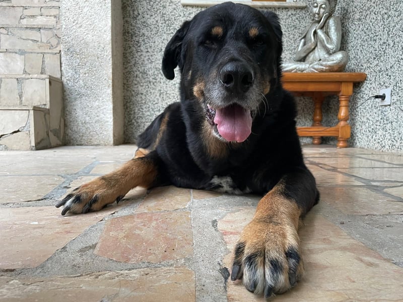 Der Rottweiler Mix hat keine Schmerzen und frisst ganz normal.