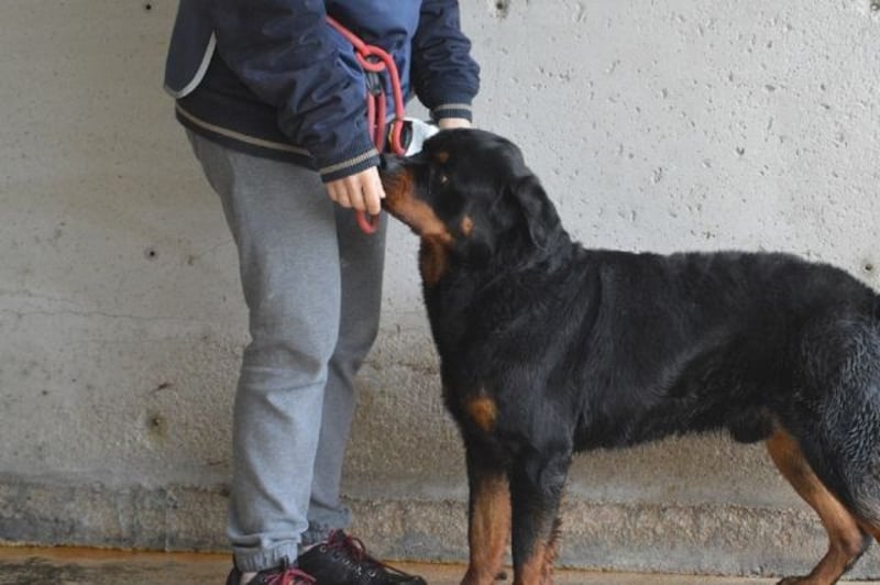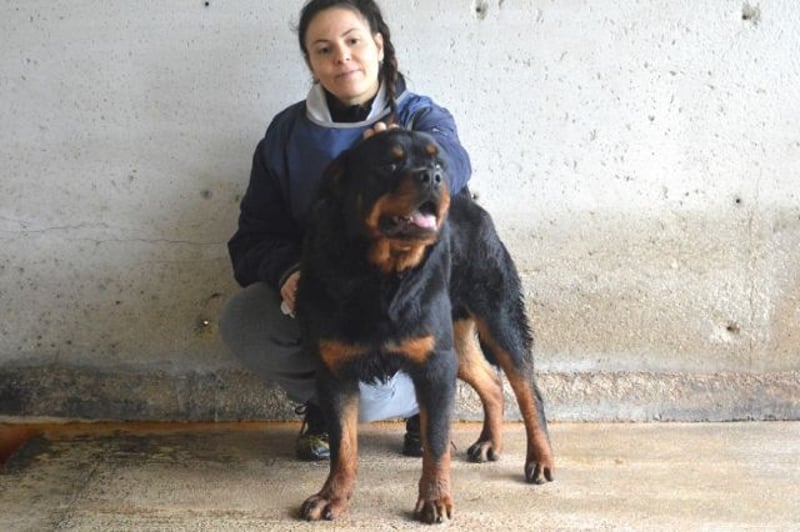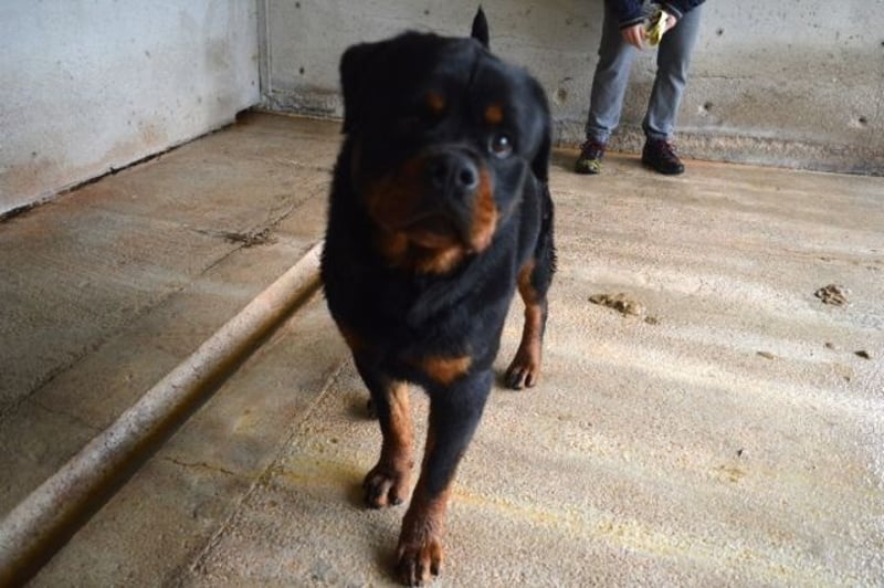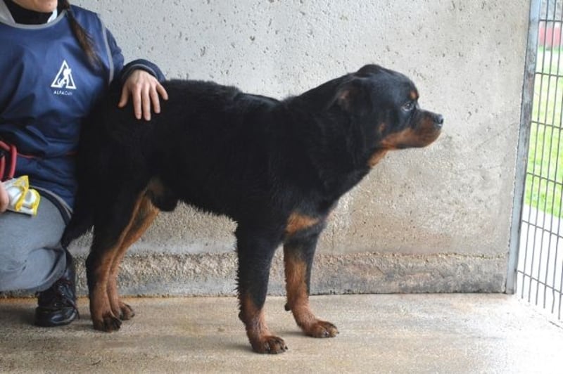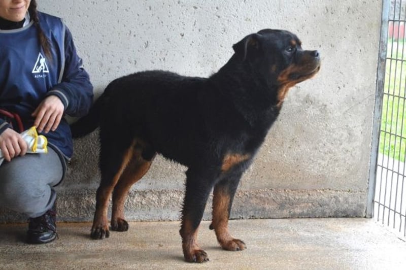 Nicht einmal, ein absolutes Musterexemplar einer wundervollen Hunderasse zu sein. Denn genau da sitzt er, unser Anoop. Und zwar schon seit bald einem Jahr (Stand Juni 2025). Ein Bild von einem Rottweiler, muskulös und kräftig, mit dem typischen „Dickschädel“! Einfach ein großartiger Kerl im besten Alter! Hatten Sie schon einmal das Glück, einen Rotti näher kennenzulernen? Haben sie da im ersten Moment – genau wie ich – ein zufriedenes „Brummen“ für ein Knurren gehalten? Ohne Frage sind Jungs (und Mädels) wie Anoop nicht unbedingt das, was man als „Anfängerhund“ bezeichnen möchte! Solch große, charakterstarke, unerschrockene Hunde möchten „gelesen“ werden und wünschen sich auch einen souveränen Partner / eine souveräne Partnerin an ihrer Seite! Hat man aber erst einmal dieses ganz besondere Band des Vertrauens knüpfen können, hat man den wohl besten und treuesten Freund aller Zeiten gewonnen! Anoop ist die Chance darauf zurzeit leider verwehrt… Er sitzt in einem gruseligen Zwinger fest. Allein – weil Artgenossen nicht so „sein Ding“ zu sein scheinen. Auch haben Isolation und Unterforderung ihn offensichtlich etwas dünnhäutig werden lassen. Zu viel Action kann momentan dazu führen, dass er einfach „überdreht“… Wie aber sehr gut auf den Fotos zu sehen ist, bringen Ruhe und liebevolle Zuwendung auch in einem Kraftpaket wie Anoop das „Schmusemonster“ zum Vorschein! Und an allem anderen kann man arbeiten.