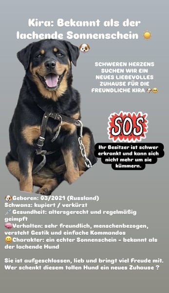 Aus schwerem Herzen und aus persönlichen, unvorhergesehenen Gründen müssen wir uns von unserer treuen Begleiterin Kira trennen. Diese Entscheidung fällt uns außerordentlich schwer und ihr Wohlergehen liegt uns sehr am Herzen. Daher suchen wir dringend ein neues, verantwortungsvolles und dauerhaftes Zuhause für sie.