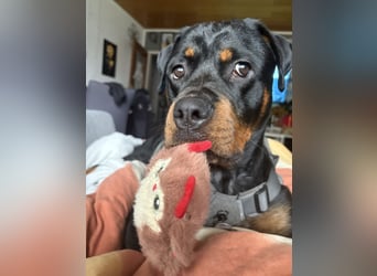 Schweren Herzens müssen wir unseren Rottweiler abgeben, da unsere Tochter leider eine Allergie entwickelt hat und er wohl nicht so mit ihr klarkommt Er ist 1 Jahr alt, sehr verspielt und liebt die Nähe zu Menschen. Er ist stubenrein und fährt unglaublich gerne Auto. Alleine bleiben fällt ihm noch etwas schwer, da er sehr menschenbezogen ist mit Geduld und Training lässt sich das aber gut verbessern. Er braucht viel Aufmerksamkeit, Bewegung und Zuwendung, daher wünschen wir uns ein zuhause bei erfahrenen Rottweilerhaltern oder Menschen, die mit großen, temperamentvollen Hunden umgehen können. Er kennt viele Kommandos Bosco liebt das schwimmen Unser Wunsch ist, dass er in ein liebevolles Umfeld kommt, in dem er genug Zeit, Auslauf und Beschäftigung bekommt. Informiert euch bitte vorher ob die Rasse in eurer Stadt erlaubt ist :) Bei ernsthaftem Interesse oder Fragen melden Sie sich bitte mit einer kurzen Vorstellung wir erzählen Ihnen gerne mehr über ihn.