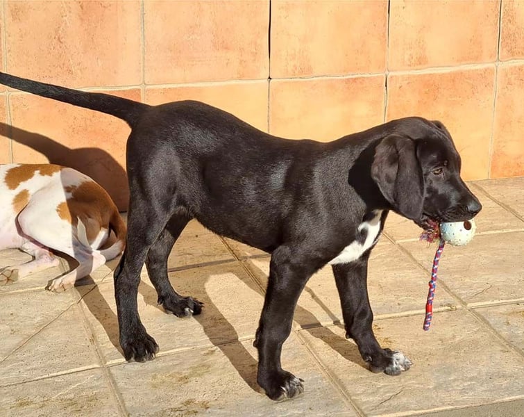 Vormittags, während des Saubermachens der Zwingeranlage, dürfen alle Hunde gemeinsam nach draußen in den großen Auslauf, und hier hat Chandler angemessenen Kontakt zu verträglichen Artgenossen und anderen Junghunden, sodass er sein gutes Sozialverhalten zeigen und weiter ausbauen kann. Er liebt es, gemeinsam mit seinen Freunden zu spielen, und wenn Sie den glücklichsten Chandler der Welt erleben möchten, dann stellen Sie eine Kiste mit Spielsachen zur Verfügung und – schwupps! – Chandler hat große Freude an Bällchen, Ziehseilen, Frisbeescheiben … Auch wenn die älteren Hunde ihm das oft abnehmen, nimmt er es gelassen hin und schaut nach einem anderen Spielzeug, mit dem er sich vergnügen kann.