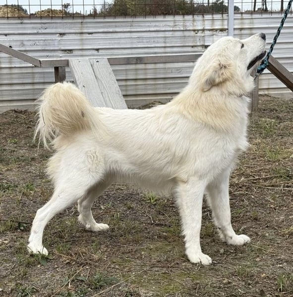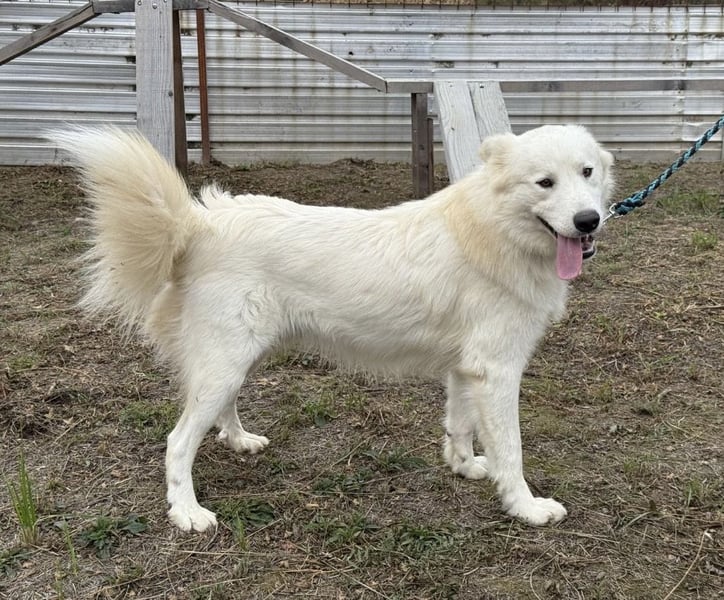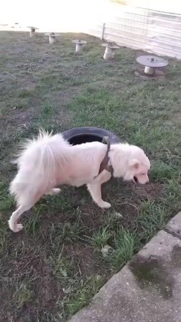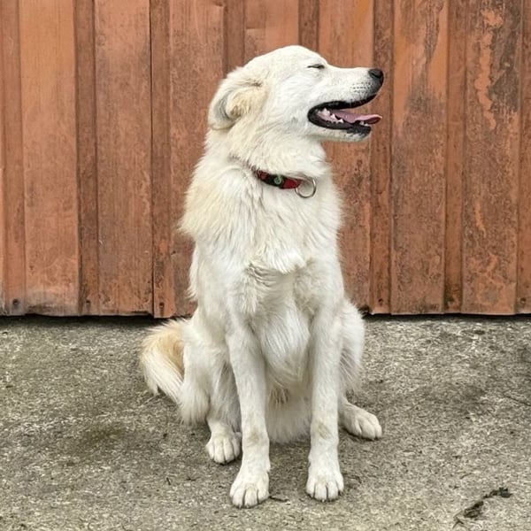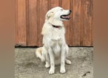 Odin ist ein Bub, laut Tierarztschätzung ca. 2 Jahre alt (geb. 10.01.2024), 60 cm groß und wiegt 25,5 kg. Vermutet wird ein Samojede-Retriever-Mischling.