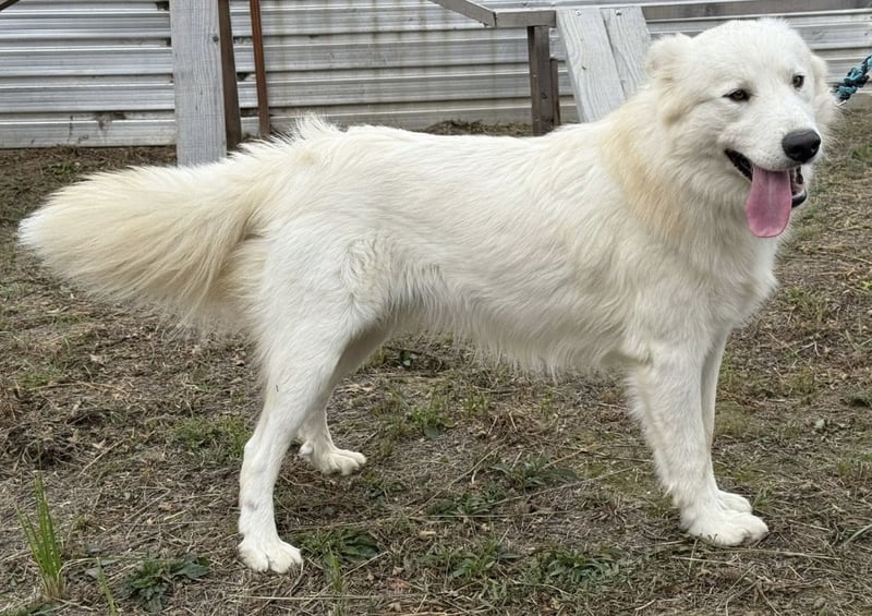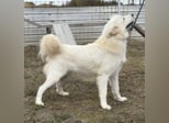 Odin ist ein Bub, laut Tierarztschätzung ca. 2 Jahre alt (geb. 10.01.2024), 60 cm groß und wiegt 25,5 kg. Vermutet wird ein Samojede-Retriever-Mischling.
