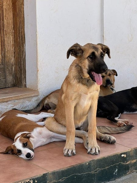 Ich bin einer der Welpen, die mit ihrer ausgesetzten Mama, einer Mastin Mischlingsdame (steht auf einem der Fotos vor mir), mit gerade einmal zwei Wochen bei Regen in den Bergen gefunden wurden. Am Anfang lebten wir in einer Pflegefamilie, aber mittlerweile lebe ich mit meiner Mama auf der Terrasse unserer Betreuer im Refugio hoch in den Bergen Andalusiens.