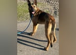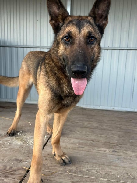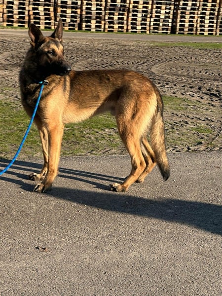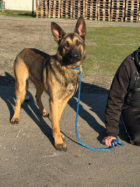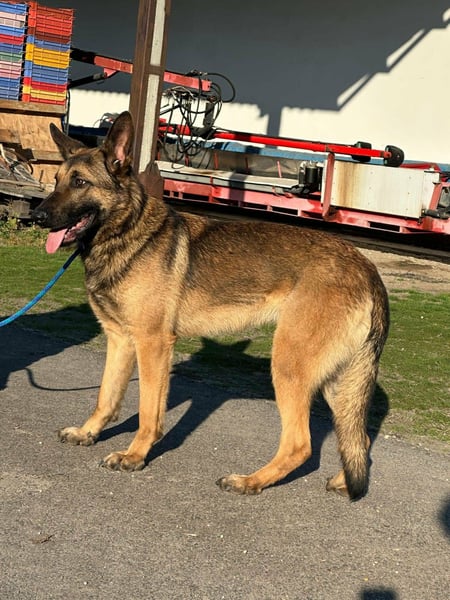 Dexter ist ein Schäferhund, geboren Mitte August 2024, und ca. 65 cm groß.