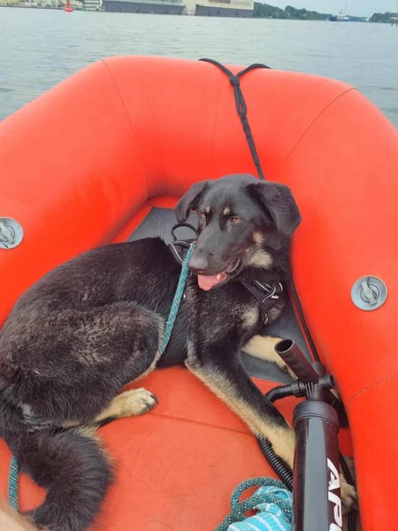 Auch beim Tierarzt zeigt sich Kiba absolut unkompliziert. Sie lässt sich anfassen, hochheben und behandeln, ohne Probleme oder Widerstand. Ihre große Neugier macht sie zu einer tollen Begleiterin in vielen Lebenslagen. Sie schwimmt sehr gerne, fährt problemlos im Boot mit und zeigt sich in neuen Situationen immer interessiert und gelassen.