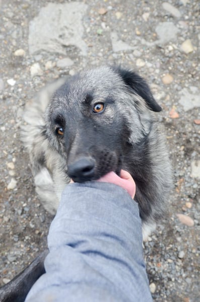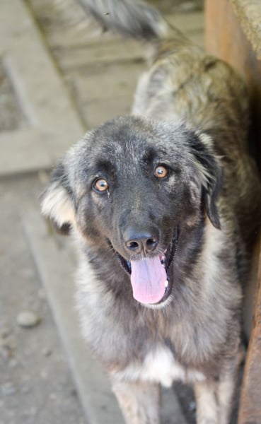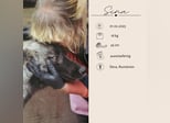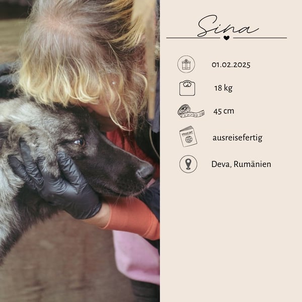 Aktuell misst SINA etwa 48 cm in der Höhe und wiegt rund 18 kg. Sie hat wunderschönes dunkelgraues Fell mit schwarzen Flecken. Sie ist sehr ausgeglichen, neugierig, liebt es zu kuscheln. Sie ist sehr verspielt, jedoch sanft dabei. Mit anderen Hunden versteht sie sich gut. Eine Familie mit etwas größeren Kindern wäre ideal für SINA, da sie das Toben und Spielen liebt. Insgesamt ist KAYA eine süße Familienhündin, die sehnsüchtig darauf wartet, mit Ihnen die große, weite Welt zu entdecken. Da in SINA ein Karpaten-Schäferhund-Mix steckt, wünschen wir uns für sie ein ländliches Zuhause - keine reine Wohnungshaltung.