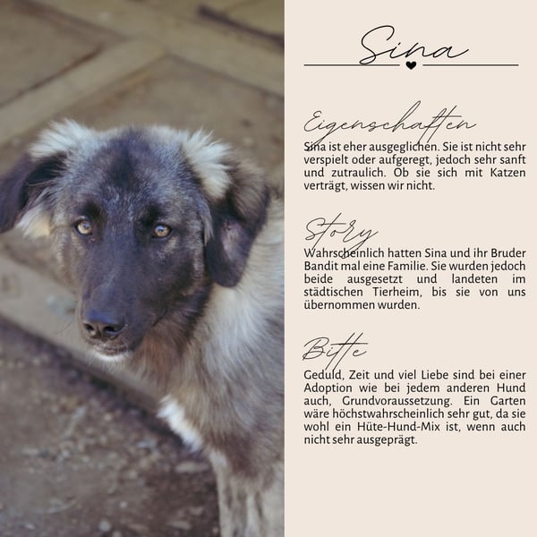 Wir freuen uns, wenn SINA bald eine liebevolle Familie findet, die ihr die Wärme und Geborgenheit schenkt, die sie verdient.