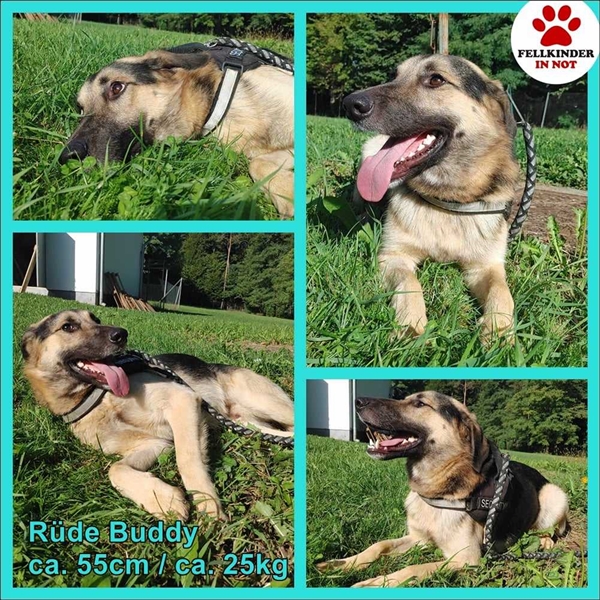 Der liebe Rüde ist noch sehr jung, fast welpenhaft und zeigt sich entsprechend unsicher. Buddy scheint noch nicht viel kennengelernt zu haben in seinem Leben und kennt auch das Laufen an der Leine noch nicht. Er ist ein absolut liebenswerter Hundebub, sehr verschmust und im Zwinger mit den anderen Hunden verspielt und freundlich.