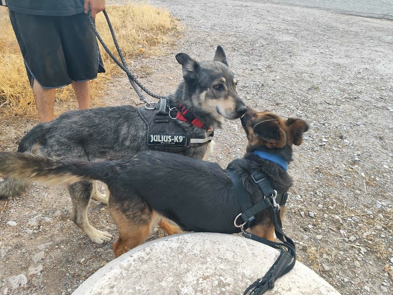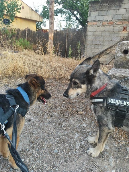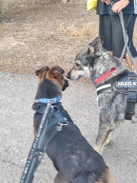 Jaisa verträgt sich gut mit ihren männlichen Artgenossen. Mit Hündinnen haben wir sie noch nicht getestet.
