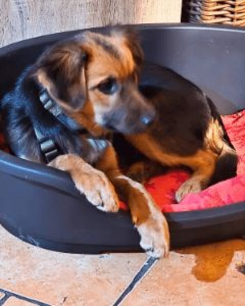 Sie versteht sich großartig mit den Hunden der Pflegestelle – so gut, dass man sie regelmäßig zu dritt im allerkleinstenKörbchen findet. Nähe, Wärme und Zusammensein? Für Leonilde das Größte. Auch den Kater findet sie klasse und akzeptiert ihn völlig selbstverständlich als Teil ihres kleinen Alltags.