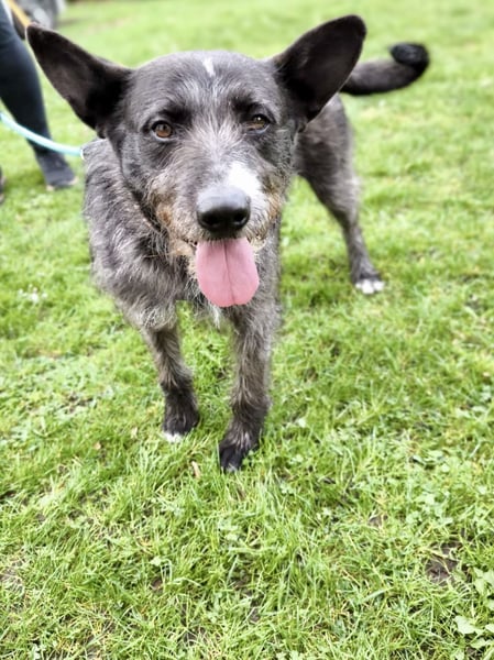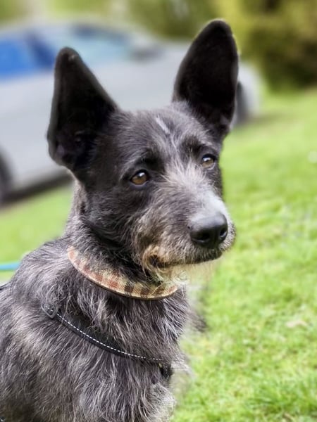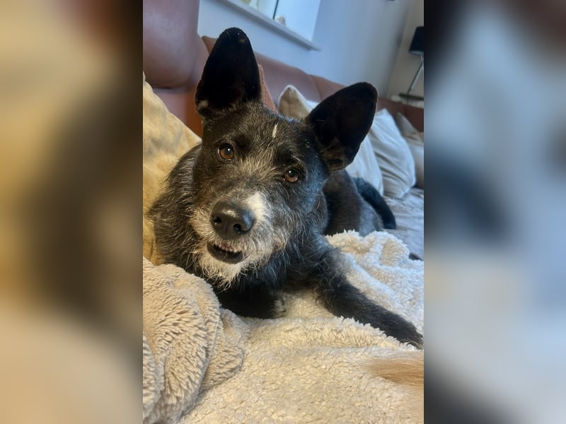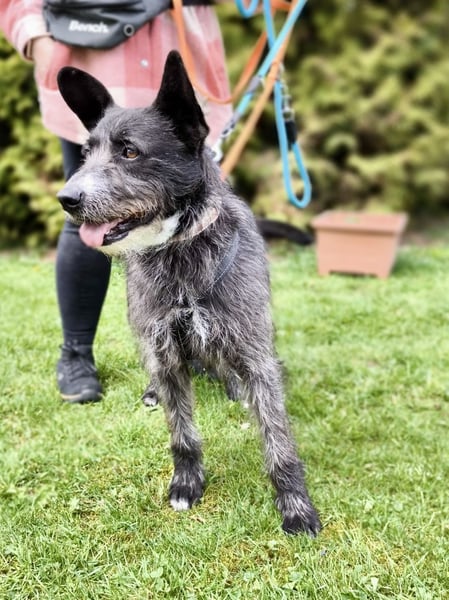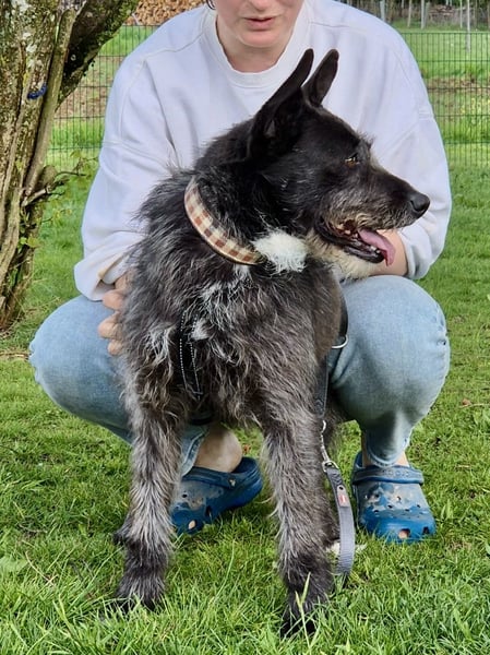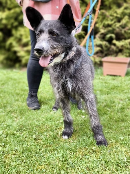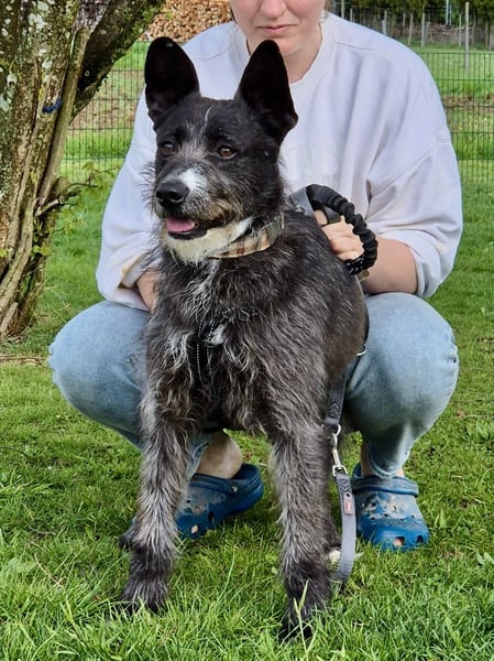 Schubi erinnert mit seinen etwa 48–50 cm, seinem charmanten, rauen Fell und den niedlichen großen Öhrchen an einen Schnauzer-Deutsch Drahthaar Mix.