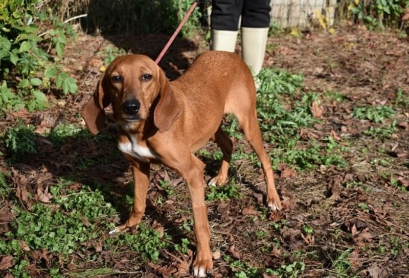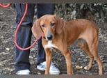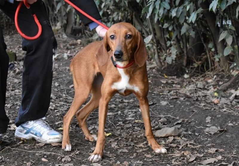 Kurzes, rehbraunes Fell mit weißer Brust und ebensolchen Zehen, Schlappohren bis zum Kinn und ein Blick aus wunderschönen braunen Augen: Clotilda ist nicht nur eine kleine Schönheit, sie hat mit Sicherheit auch ein paar Jagdhundgene im System. Und mit ebensolcher Sicherheit ist sie da, wo sie sich aktuell befindet (hinter Gittern), am komplett falschen Ort.