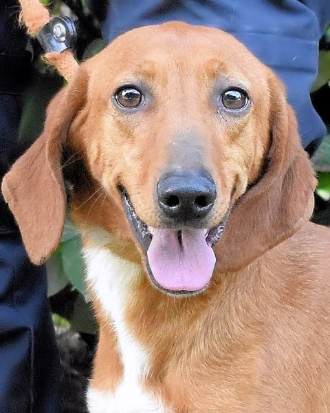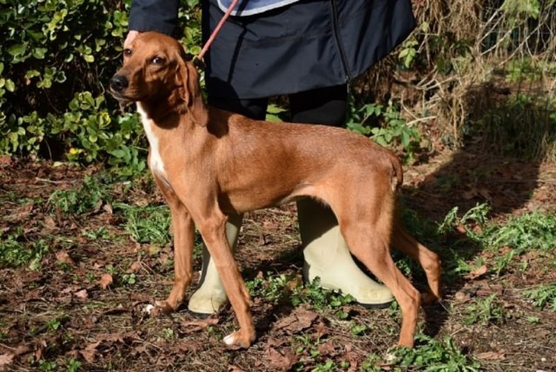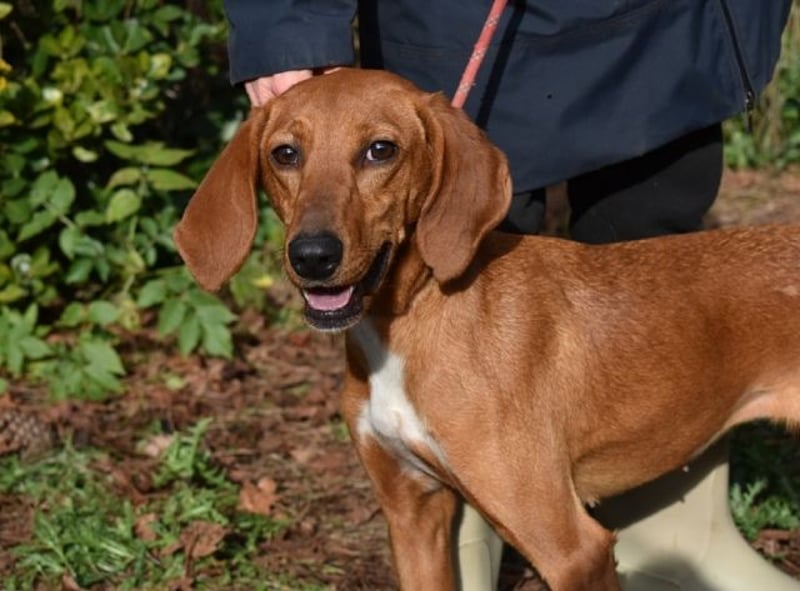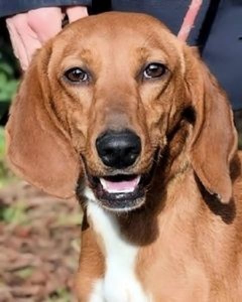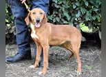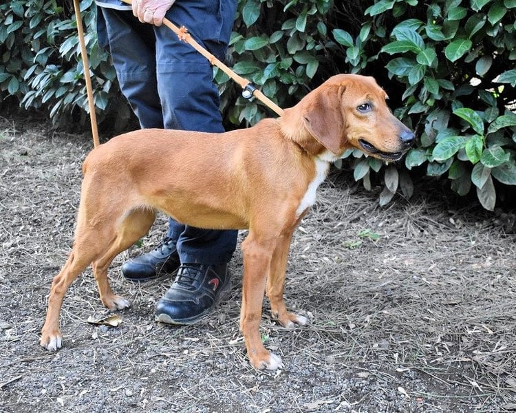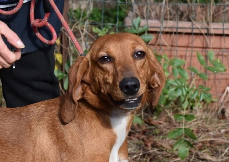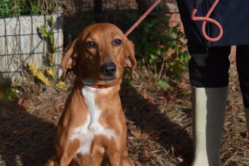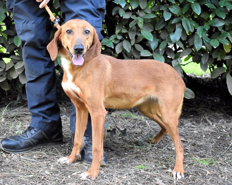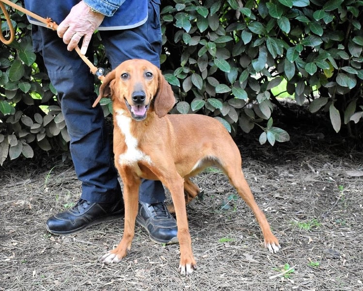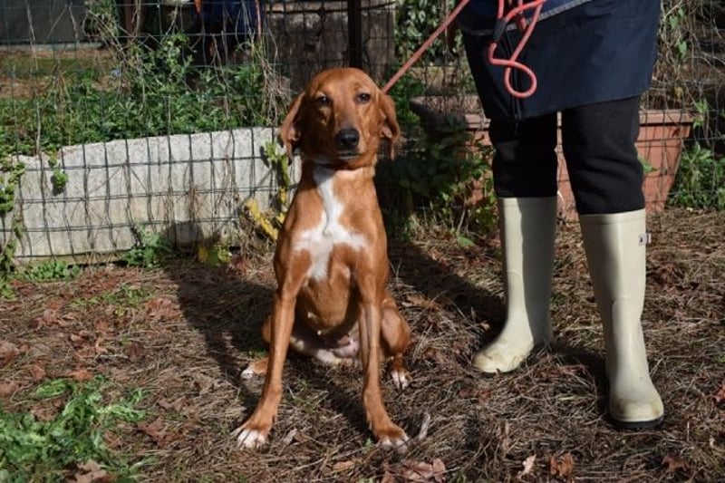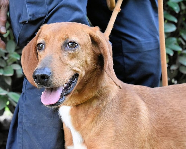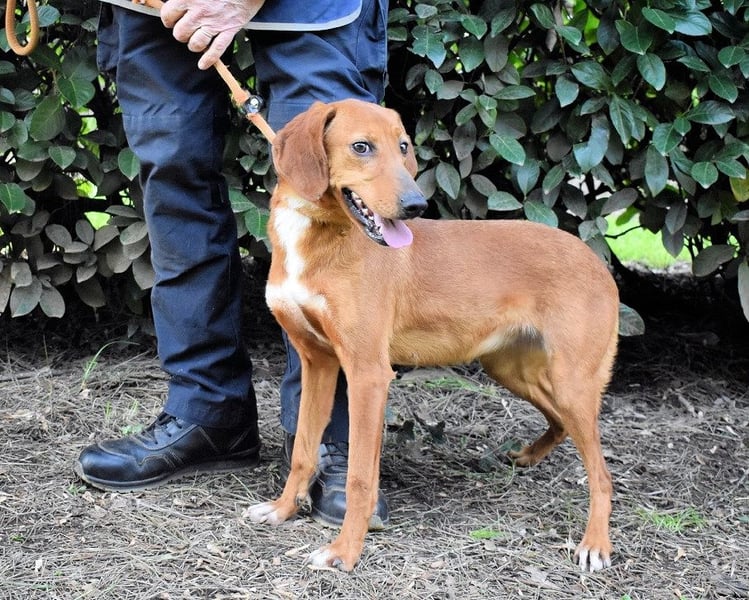 Kurzes, rehbraunes Fell mit weißer Brust und ebensolchen Zehen, Schlappohren bis zum Kinn und ein Blick aus wunderschönen braunen Augen: Clotilda ist nicht nur eine kleine Schönheit, sie hat mit Sicherheit auch ein paar Jagdhundgene im System. Und mit ebensolcher Sicherheit ist sie da, wo sie sich aktuell befindet (hinter Gittern), am komplett falschen Ort.