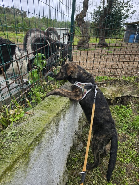 Im Innenhof, wo sie frei laufen kann für eine kurze Zeit, zeigt sie sich sozial mit den anderen Hunden. Ruft man sie, kommt sie angelaufen und drückt sich ganz fest an. Sie liebt es, gestreichelt zu werden.