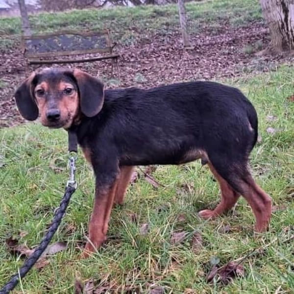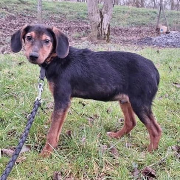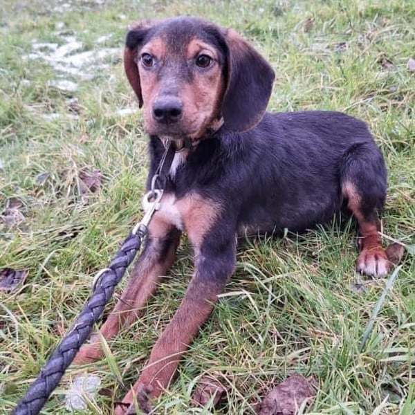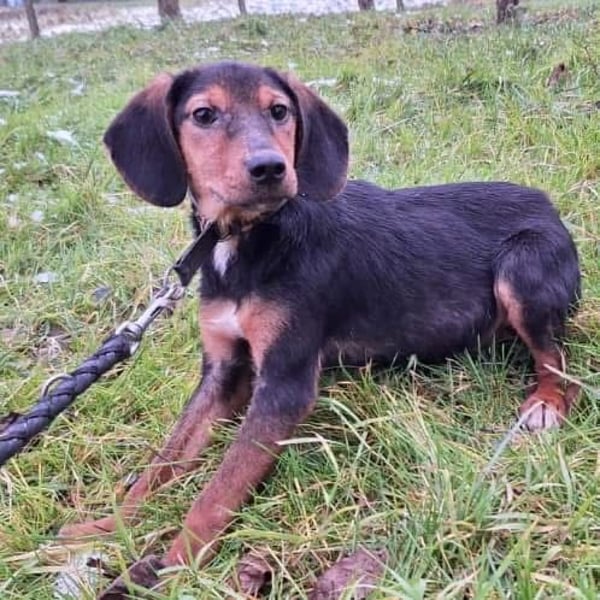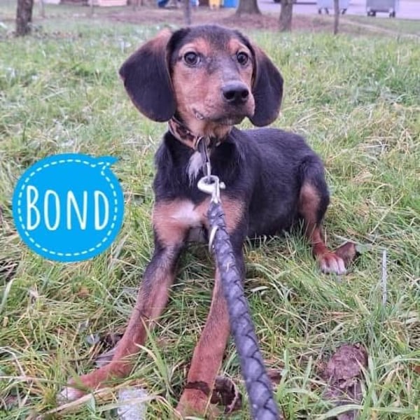 Bond ist ein Bub, er ist laut Tierarztschätzung ca. 5 Monate alt (geb. 17.08.2024), wiegt zur Zeit ca. 6,5kg und ist 35cm groß. Seine Schlappohren verraten, dass er ein Jagdhund Mischling ist, vermutlich ein Serbischer Laufhund. Er wird ausgewachsen mit ca. 17kg mittelgroß.