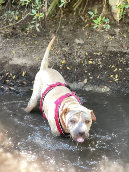 Chapi hat das Gesicht, die Körperform und die blau- gepunktete Zunge eines Shar Pei, aber nicht die typischen großen Falten am Körper. Und so sind seine Haut und sein Körper in sehr gutem Zustand und er benötigt aktuell keine spezielle Diät oder Medikamente: ein durch und durch fitter Rüde und ein echter „Pfundskerl“!