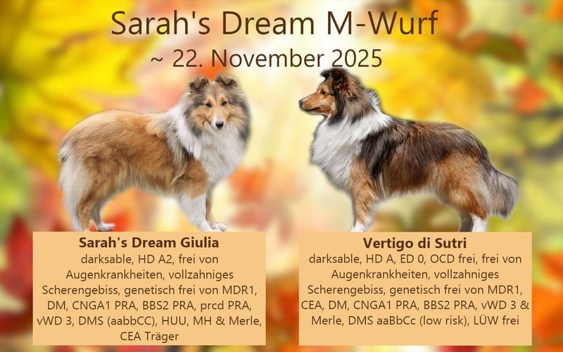 Die Welpen werden somit alle genetisch frei von MDR1, DM, CNGA1 PRA, BBS2 PRA, vWD 3 und Merle sein und genetisch und/oder klinisch frei von CEA.