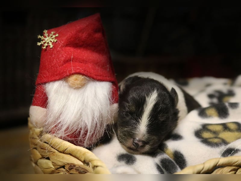Wir haben dreifarbige und zweifarbige blaue/merle Welpen.