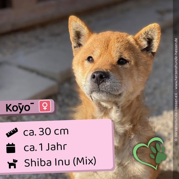 Dort zeigt sie sich als eine unheimlich süße und sanfte Shiba-Inu-Hündin. Die etwa einjährige Kōyō hatte keinen leichten Start; als sie gefunden wurde, litt sie unter Räude, einer parasitären Hauterkrankung. Doch die junge Hündin ist eine Kämpferin: Sie wurde bereits erfolgreich behandelt, ist mittlerweile wieder vollkommen gesund und ihre Haut sowie ihr Fell regenerieren sich erstaunlich schnell.