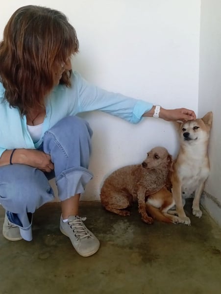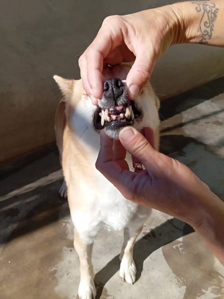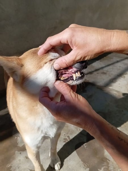 Besonders auffällig ist, dass Daiky einige Zähne verloren hat, vor allem im oberen Bereich. Vielleicht war es der Versuch, sich aus den engen Grenzen ihres früheren Lebens zu befreien, indem sie an Türen nagte. Diese kleine Eigenheit macht sie einzigartig und erzählt von ihrer Stärke. Trotz dieser Besonderheit ist sie eine liebenswerte Begleiterin, die mit anderen Hündinnen problemlos spielt und sich im Alltag gut integriert.