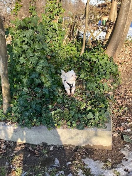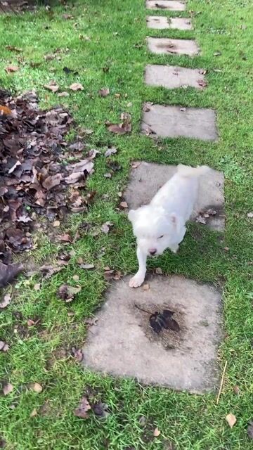 Er hat ein dichtes weißes Fell und hat ein fröhliches Gemüt.