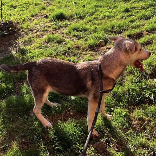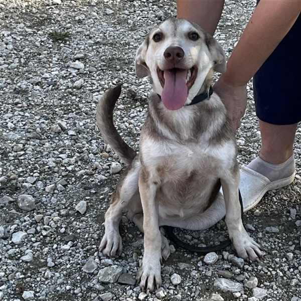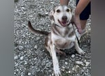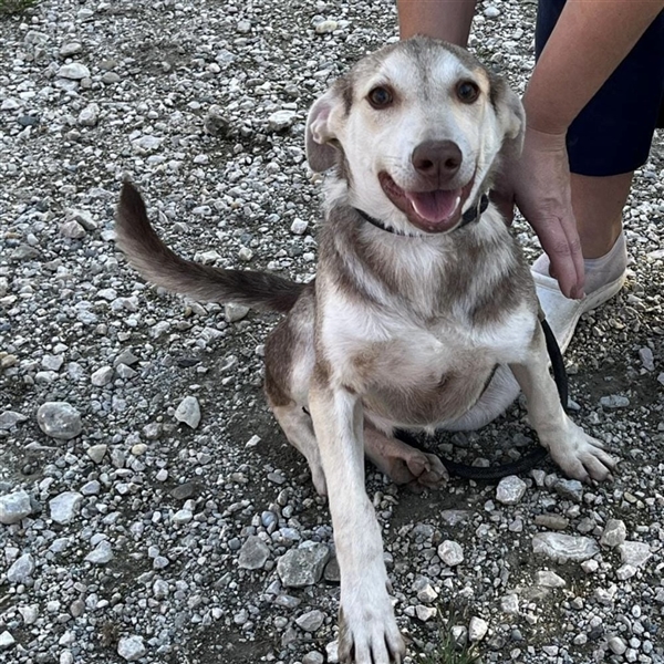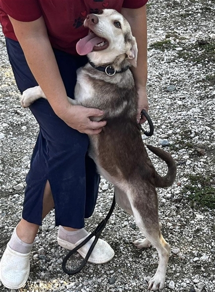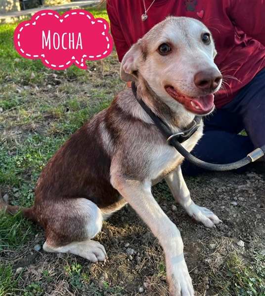 Mocha ist ein Mädchen, sie ist ca. 7 Monate alt (geb. 20.03.2024), wiegt 12kg und ist mit 48cm groß. Vermutet wird ein Polarhund (Husky) Mischling.