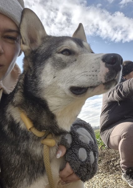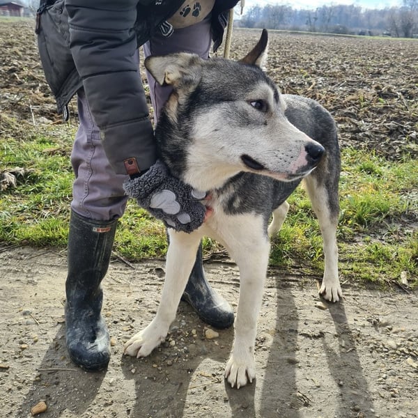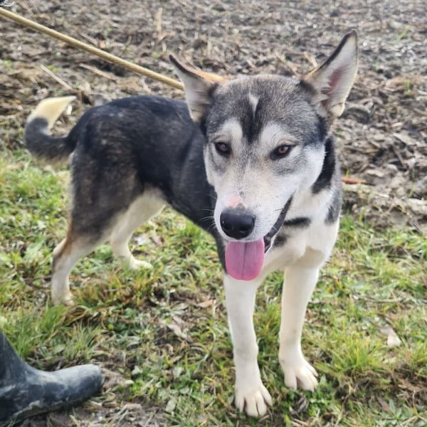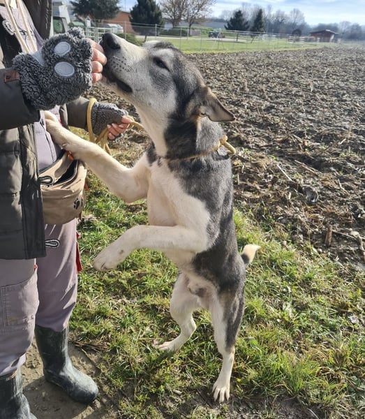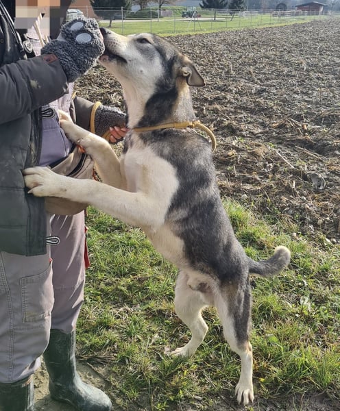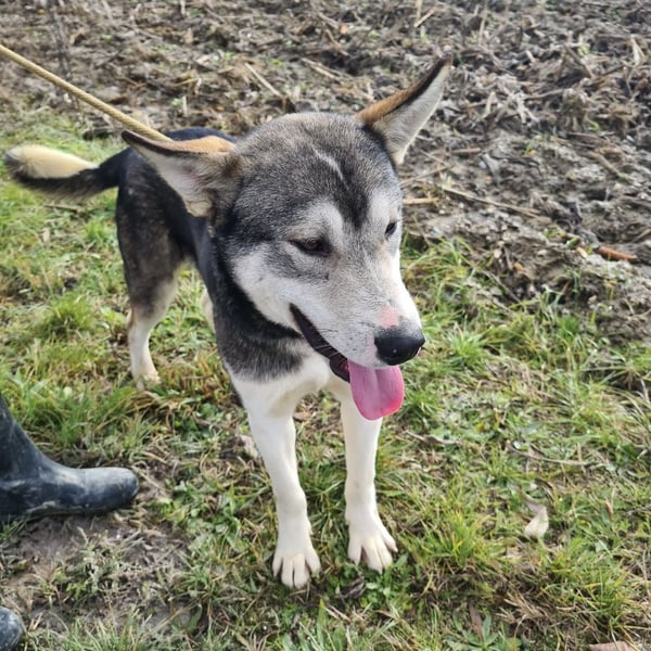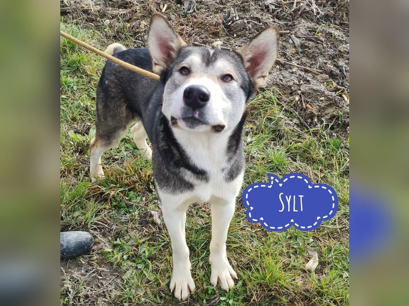 Sylt ist ein Bub, er ist laut Tierarztschätzung ca. 2 Jahre alt (geb. 01.02.2024), wiegt 27 kg und ist 64 cm groß. Vermutet wird ein Sibirischer Husky.